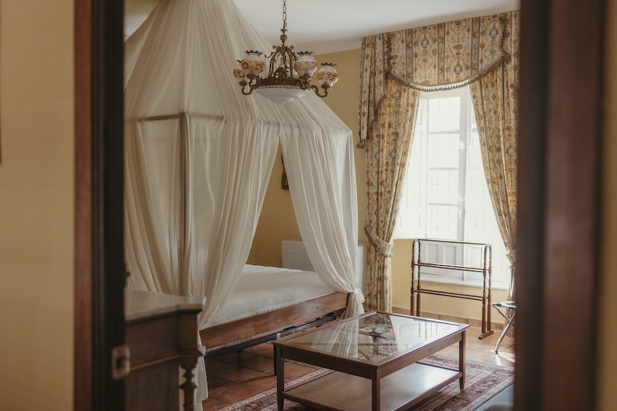 Suite de lujo donde el encanto y el confort se encuentran en cada detalle. Una majestuosa cama con dosel es el centro de atención, acompañada de un aparador, mesa auxiliar, sofá y sillón. Aquí el lujo se fusiona con la comodidad para ofrecerle una experiencia inolvidable.