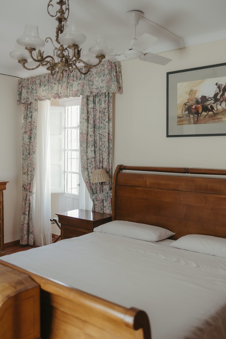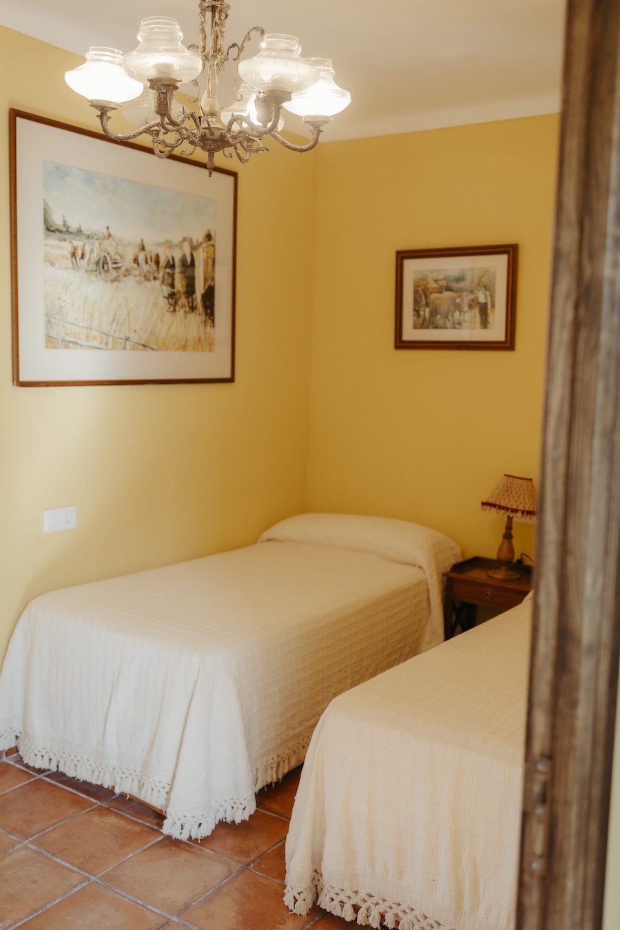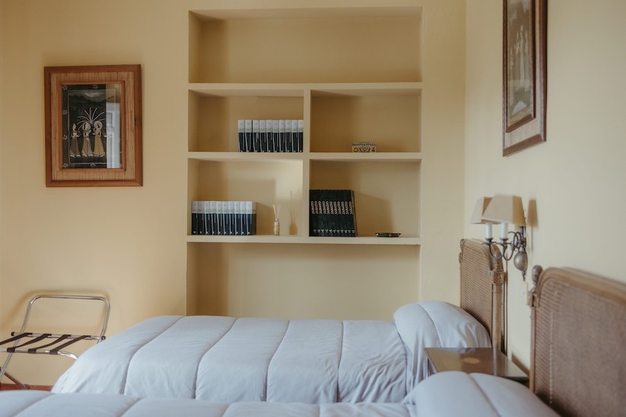 Equipada con dos camas individuales, mesita auxiliar y perchero, esta luminosa habitación se abre a nuestro patio andaluz con sus naranjos y su fuente central.